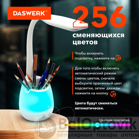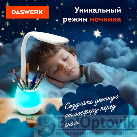 Многофункциональный светильник DASWERK является незаменимым атрибутом рабочего места. Светильник оборудован органайзером для канцелярии, USB-разъемом для зарядки гаджетов, RGB-подсветкой. Отличный вариант для школьника и студента.