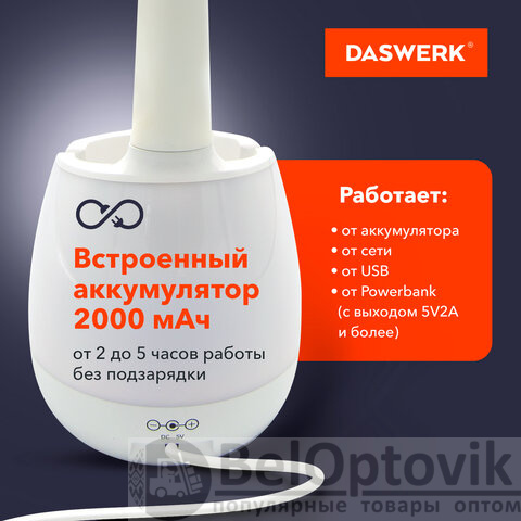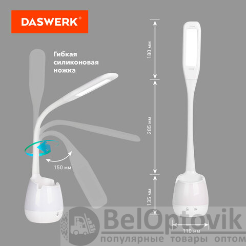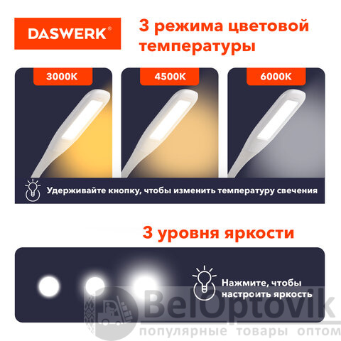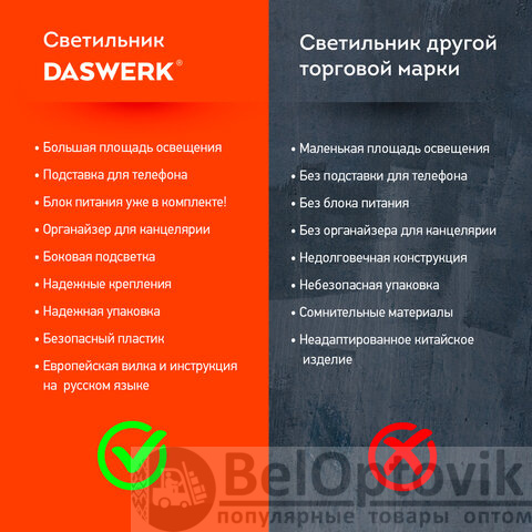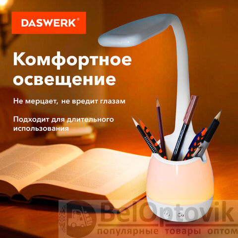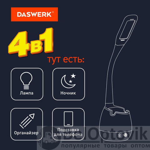 Покупайте настольный светильник DASWERK – он прост в управлении, практичен в использовании и совершенно надежен! Пригодится дома или на работе!
