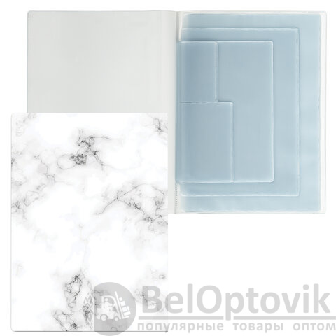 Модель выполнена из ПВХ с цветным принтом на обложке, включает в себя внутренний блок матовых вкладышей плотностью 120 мкм: