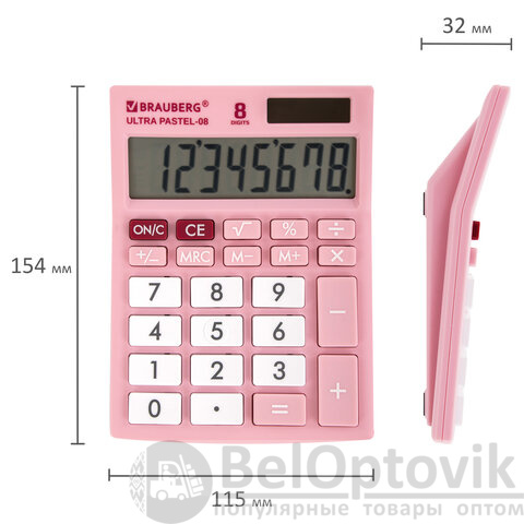 Калькулятор настольный BRAUBERG ULTRA PASTEL-08-PK, КОМПАКТНЫЙ (154x115 мм), 8 разрядов, двойное питание, РОЗОВЫЙ, 250514