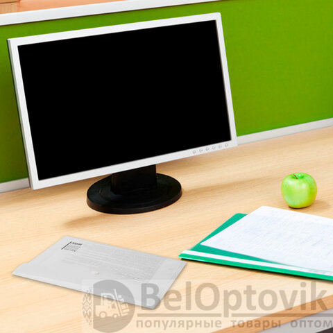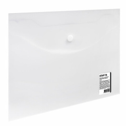 Папка-конверт с гладкой фактурой формата А5 изготовлена из плотного матового полупрозрачного пластика толщиной 150 мкм. Закрывается на защелку-кнопку, что способствует удобству при частом использовании и обеспечивает быстрый доступ к содержимому. Папка способна вместить до 100 листов стандартной плотности.