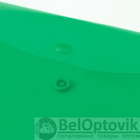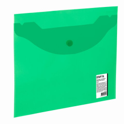 Папка-конверт с гладкой фактурой формата А5 изготовлена из плотного матового полупрозрачного зеленого пластика толщиной 150 мкм. Закрывается на защелку-кнопку, что обеспечивает быстрый доступ к бумагам. Папка вмещает до 100 листов стандартной плотности.