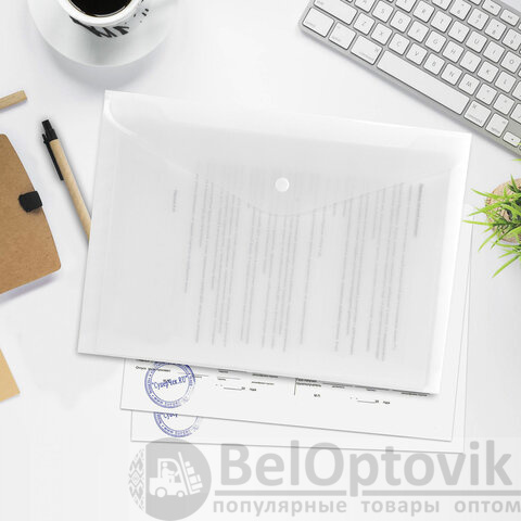 Папка-конверт с гладкой фактурой формата А4 изготовлена из плотного матового пластика, бесцветная толщиной 180 мкм. Закрывается на защелку-кнопку, что делает удобным частое использование и обеспечивает быстрый доступ к ее содержимому. Папка способна вместить до 100 листов стандартной плотности.