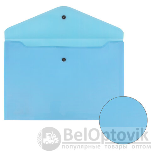 Папка-конверт с гладкой фактурой формата А4 изготовлена из плотного непрозрачного пластика цвета аквамарин толщиной 180 мкм. Закрывается на защелку-кнопку, что делает удобным частое использование и обеспечивает быстрый доступ к ее содержимому. Папка способна вместить до 100 листов стандартной плотности.