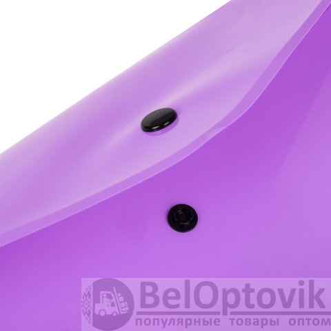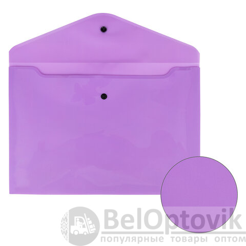 Папка-конверт с гладкой фактурой формата А4 изготовлена из плотного непрозрачного пластика лилового цвета толщиной 180 мкм. Закрывается на защелку-кнопку, что делает удобным частое использование и обеспечивает быстрый доступ к ее содержимому. Папка способна вместить до 100 листов стандартной плотности.