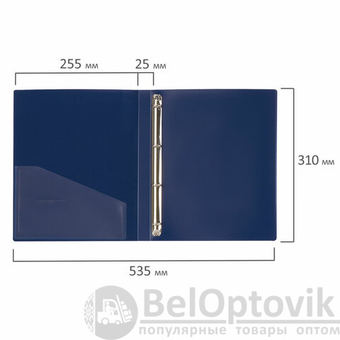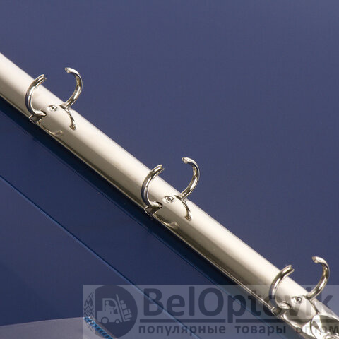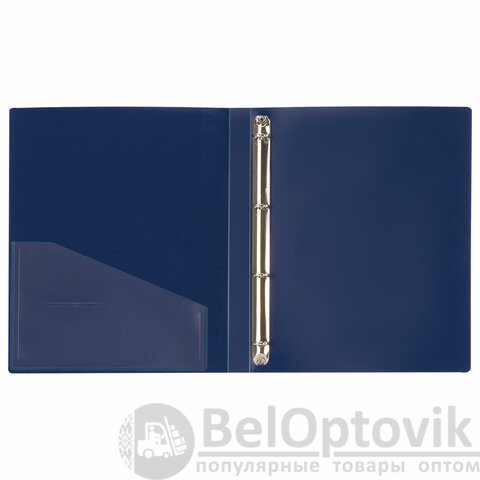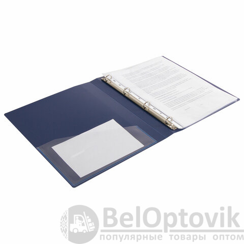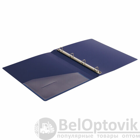 Папка стандартного формата А4 вмещает до 170 листов. Изготовлена из высококачественного пластика толщиной 0,7 мм синего цвета со стандартной фактурой. Допускается влажная обработка поверхности. Внутренняя сторона обложки снабжена прозрачным карманом. Для идентификации содержимого на корешке папки имеется карман. Ширина корешка составляет 25 мм. Папка оснащена четырьмя кольцами, которые обеспечивают надежное хранение документов. В неё можно вставлять файлы или проколотые дыроколом листы и, при необходимости, заменять их на другие. Каждая папка упакована в индивидуальный пакет.