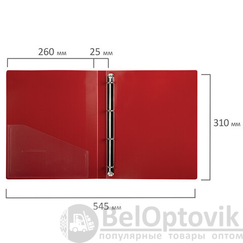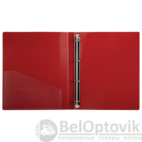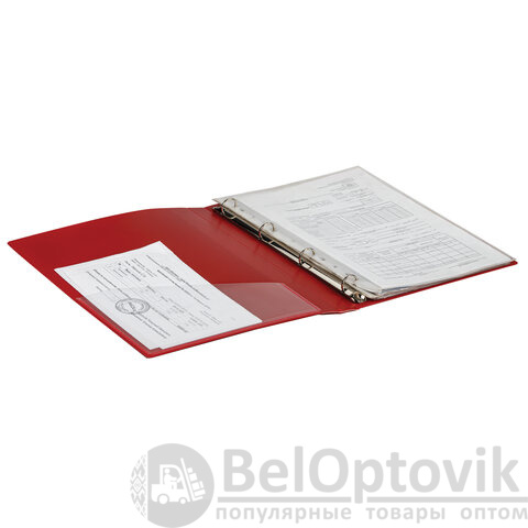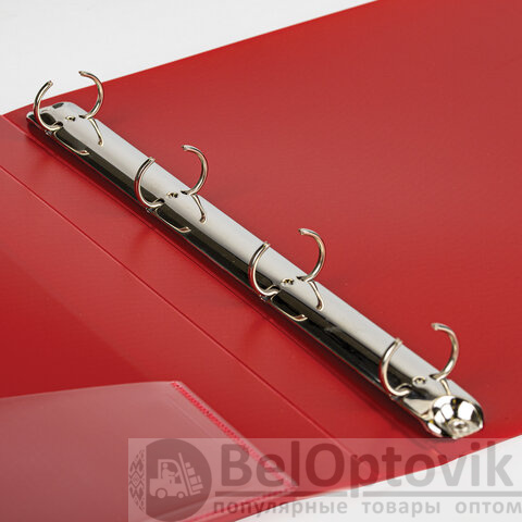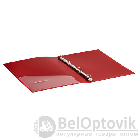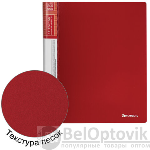 Папка стандартного формата А4 вмещает до 170 листов. Изготовлена из высококачественного пластика толщиной 0,7 мм красного цвета со стандартной фактурой. Допускается влажная обработка поверхности. Внутренняя сторона обложки снабжена прозрачным карманом. Для идентификации содержимого на корешке папки имеется карман. Ширина корешка составляет 25 мм. Папка оснащена четырьмя кольцами, которые обеспечивают надежное хранение документов. В неё можно вставлять файлы или проколотые дыроколом листы и, при необходимости, заменять их на другие. Каждая папка упакована в индивидуальный пакет.