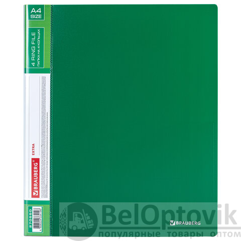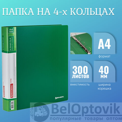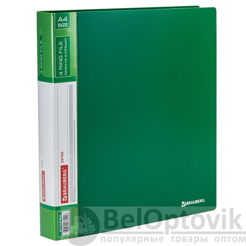 Папка на 4 кольцах, ширина 40 мм, BRAUBERG EXTRA, до 300 листов, ЗЕЛЕНАЯ, 0,8 мм, 270550