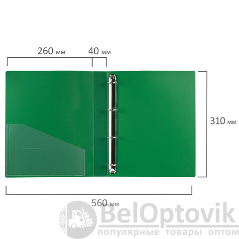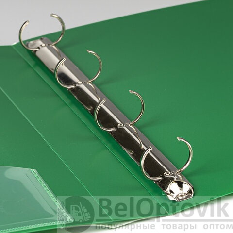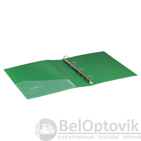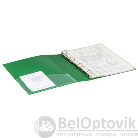 Папка стандартного формата А4 вмещает до 300 листов. Изготовлена из высококачественного пластика толщиной 0,8 мм зеленого цвета со стандартной фактурой. Допускается влажная обработка поверхности. Внутренняя сторона обложки снабжена прозрачным карманом. Для идентификации содержимого на корешке папки имеется карман. Ширина корешка составляет 40 мм. Папка оснащена четырьмя кольцами, которые обеспечивают надежное хранение документов. В неё можно вставлять файлы или проколотые дыроколом листы и, при необходимости, заменять их на другие. Каждая папка упакована в индивидуальный пакет.