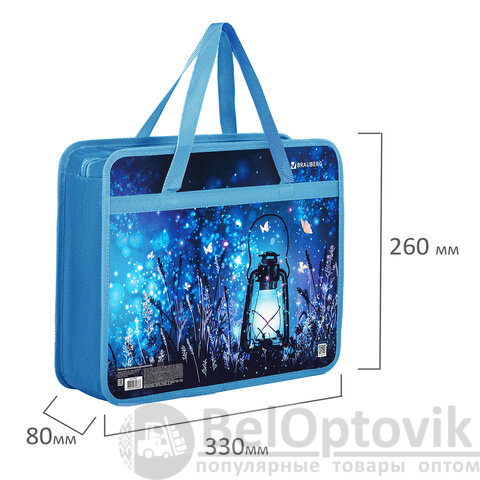 Размер папки – 330х260 мм, ширина – 80 мм. Широкий формат товара позволяет разместить большое количество канцелярских принадлежностей для творчества внутри, в том числе стакан-непроливайку. Папка имеет удобную застежку-молнию сверху. Прочные ручки с надежным креплением к папке, изготовленные из тесьмы, способствуют комфортной переноске при большой нагрузке.
