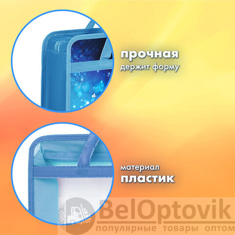 Папка-сумка с ручками подходит для бумаг, документов и учебных пособий формата А4. Изготовлена из прочного износостойкого пластика с тканевой окантовкой по краям.