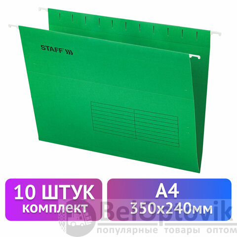 Подвесные папки А4 (350х240 мм) до 80 л., КОМПЛЕКТ 10 шт., зеленые, картон, STAFF, 270929