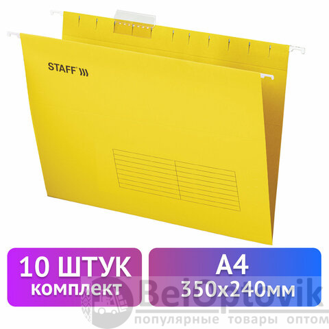 Подвесные папки А4 (350х240 мм) до 80 л., КОМПЛЕКТ 10 шт., желтые, картон, STAFF, 270930