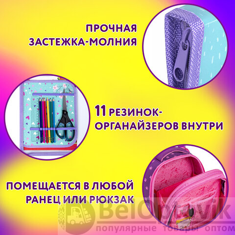 Папка на молнии выполнена из прочного пластика, что обеспечивает долговечность и надежность. Двухсторонняя яркая и красочная печать коллекционного дизайна. Внутри одно основное отделение и откидная планка с резинками-органайзером для канцелярии. Размер папки – 330х230 мм, ширина – 25 мм. Застежка-молния, расположенная с трех сторон папки, обеспечивает быстрый доступ к содержимому. Идеально подходит для транспортировки и хранения канцелярских принадлежностей, тетрадей, учебников и пособий формата А4