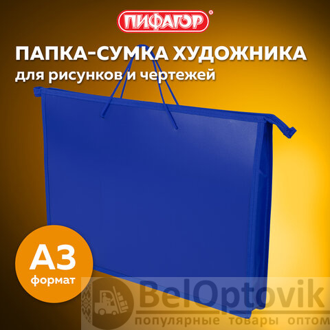 Папка ПИФАГОР предназначена для хранения чертежей, рисунков и других художественных изображений формата А3. Выполнена из пластика, по краям имеет тканевую окантовку. Одно отделение. Застежка-молния расположена по верхнему краю папки.