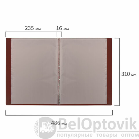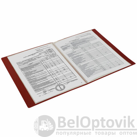 Для маркировки содержимого на корешок наклеена этикетка. Папка изготовлена из качественного пластика толщиной 0,5 мм с антибликовой фактурой, а ширина корешка составляет 16 мм. Содержит 10 вкладышей, позволяющих хранить документы формата А4 и обеспечивающих их надежную защиту от попадания влаги, пыли и прочих повреждений.