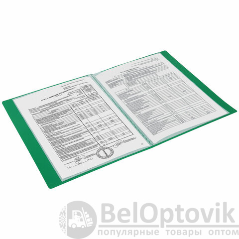 Для маркировки содержимого на корешок наклеена этикетка. Папка изготовлена из качественного пластика толщиной 0,5 мм с антибликовой фактурой, а ширина корешка составляет 20 мм. Содержит 30 вкладышей, позволяющих хранить документы формата А4 и обеспечивающих их надежную защиту от попадания влаги, пыли и прочих повреждений.