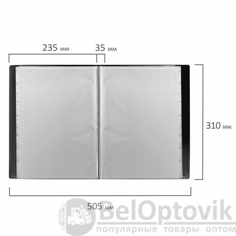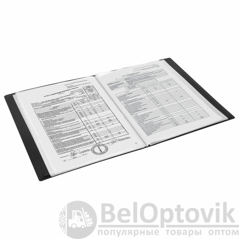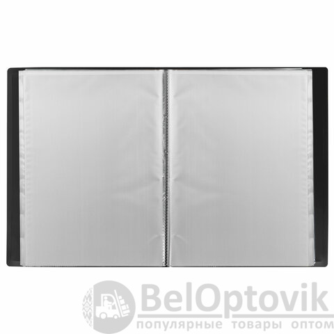 Для маркировки содержимого на корешок наклеена этикетка. Папка изготовлена из качественного пластика толщиной 0,8 мм с антибликовой фактурой, а ширина корешка составляет 35 мм. Содержит 80 вкладышей, позволяющих хранить документы формата А4 и обеспечивающих их надежную защиту от попадания влаги, пыли и прочих повреждений.