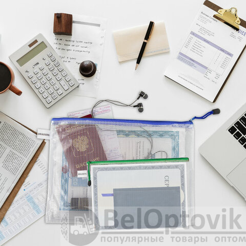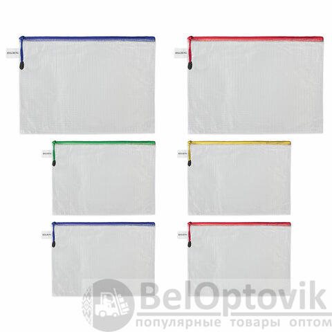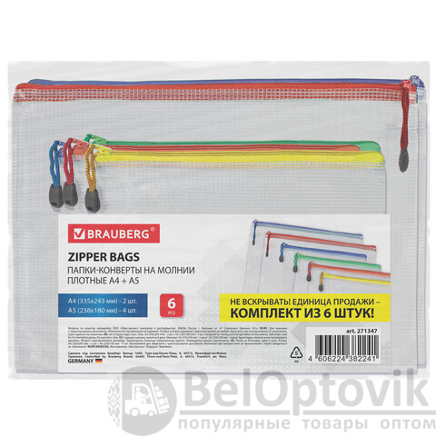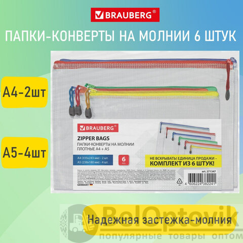 Папка-конверт СУПЕР КОМПЛЕКТ на молнии ПЛОТНЫЕ, 6 шт. (А4 - 2 шт., А5 - 4 шт.), сетчатая, BRAUBERG, 271347
