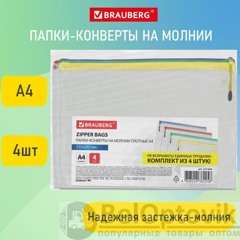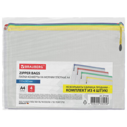 Комплект папок-конвертов на молнии BRAUBERG из 4 штук формата А4 идеально подойдет для хранения и транспортировки бумаг и документов.