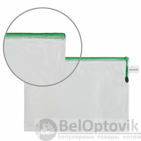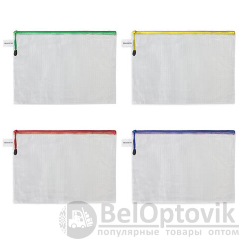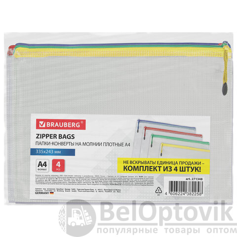 Папка-конверт СУПЕР КОМПЛЕКТ на молнии ПЛОТНЫЕ 4 штуки А4, сетчатая, BRAUBERG, 271348