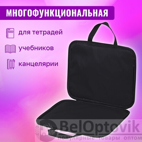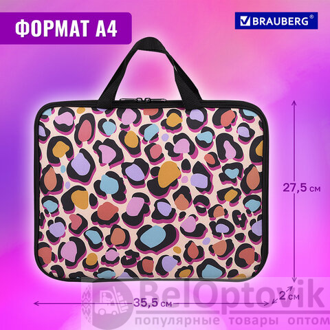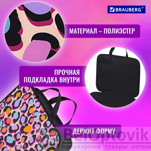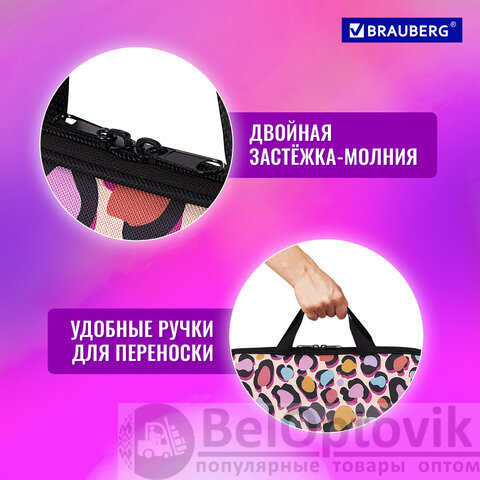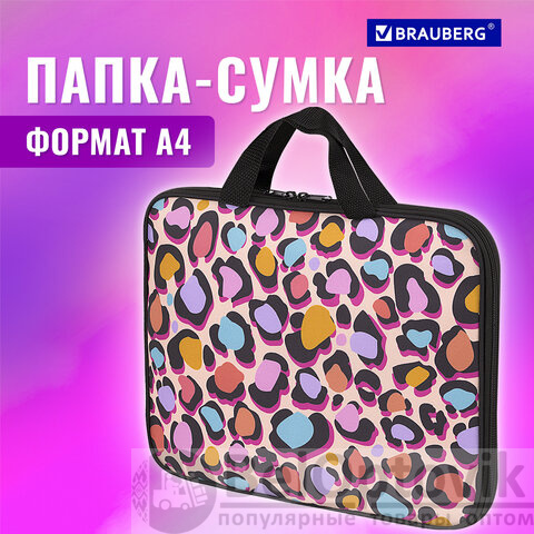 Папка для тетрадей BRAUBERG формата А4 с ручками для переноски. Изготовлена из плотного полиэстера с подкладкой внутри. Одно отделение. Застегивается на молнию. Папка держит форму за счет прорезиненного канта по краям. Яркая цветная печать.