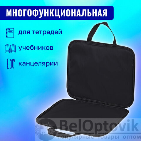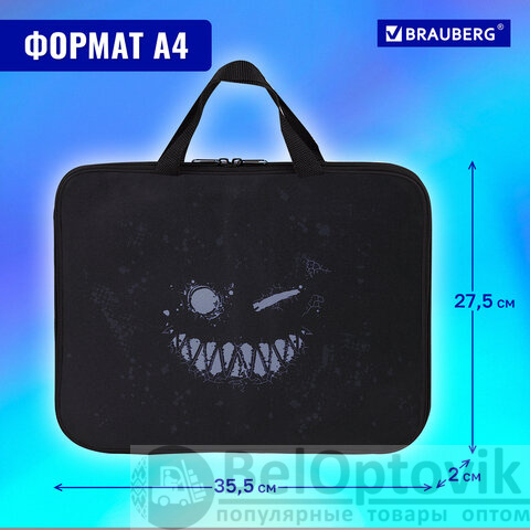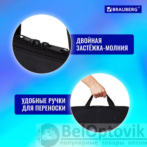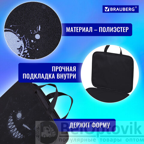 Папка для тетрадей BRAUBERG формата А4 с ручками для переноски. Изготовлена из плотного полиэстера с подкладкой внутри. Одно отделение. Застегивается на молнию. Папка держит форму за счет прорезиненного канта по краям. Яркая цветная печать.