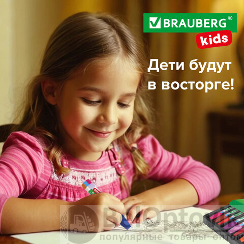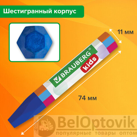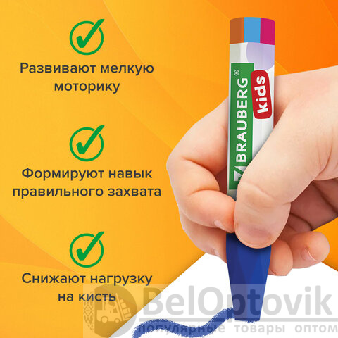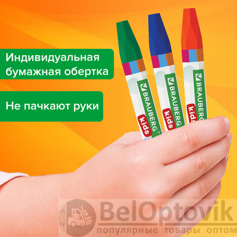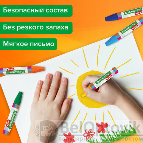 Восковые мелки на масляной основе BRAUBERG KIDS формируют навык правильного захвата, отлично развивают мелкую моторику рук. Идеальны для рисования на бумаге любого типа, а также дереве, картоне, стекле.