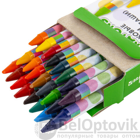 Каждый мелок обернут в бумажную гильзу, которая предотвращает скольжение пальцев и позволяет не пачкать руки. Восковые мелки упакованы в картонную коробку с европодвесом.