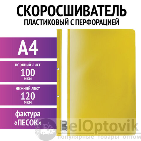 Скоросшиватель пластиковый с перфорацией STAFF, А4, 100/120 мкм, желтый, 271716