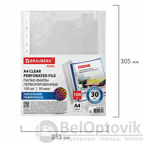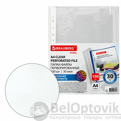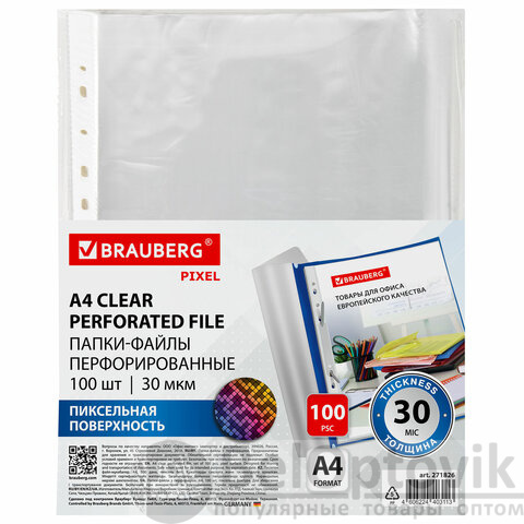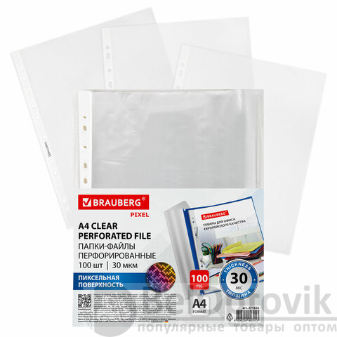 Папки-файлы перфорированные с антибликовой текстурой А4 BRAUBERG PIXEL, КОМПЛЕКТ 100 шт., 30 мкм, 271826
