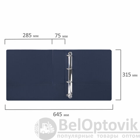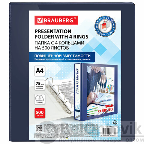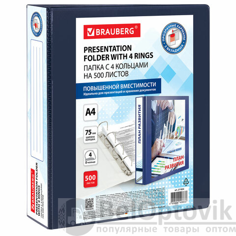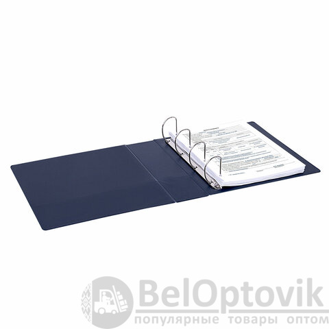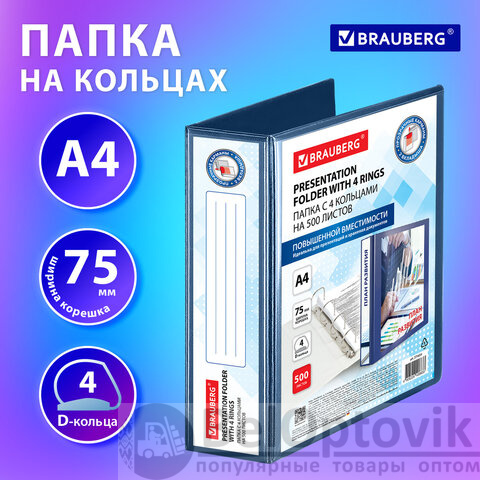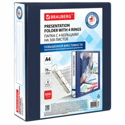 Папка ПАНОРАМА на 4 кольцах, ПРОЧНАЯ, картон/ПВХ, BRAUBERG "Office", СИНЯЯ, 75 мм, до 500 листов, 271854