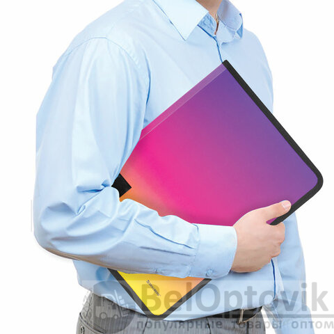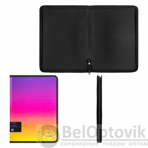Изготовлена из прочного непрозрачного матового пластика толщиной 600 микрон. Формат А4 (330x240 мм). Надежный замок-молния защищает документы от механических повреждений, пыли и влаги. Папка представлена в эффекте градиент.