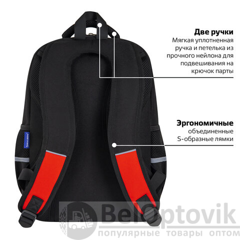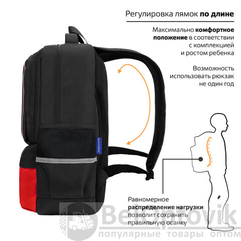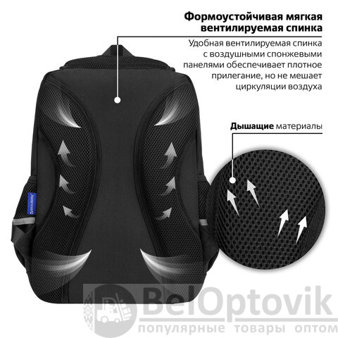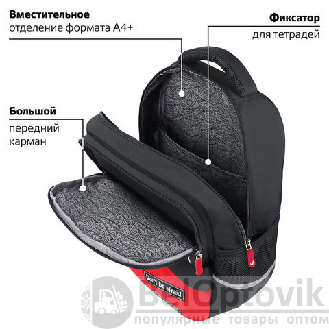 В основном отделении рюкзака можно легко и быстро разместить учебники и тетради формата А4+, а также воспользоваться прижимными разделителями. Спереди рюкзака располагаются два больших кармана на молнии, которые вмещают тетради формата А5 и прочие канцелярские принадлежности, и небольшой карман для различных мелочей или телефона. Такая организация пространства позволит держать школьные принадлежности в сохранности и поможет приучить ребенка к порядку.