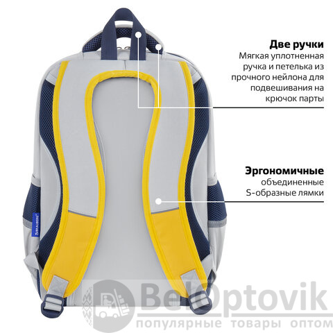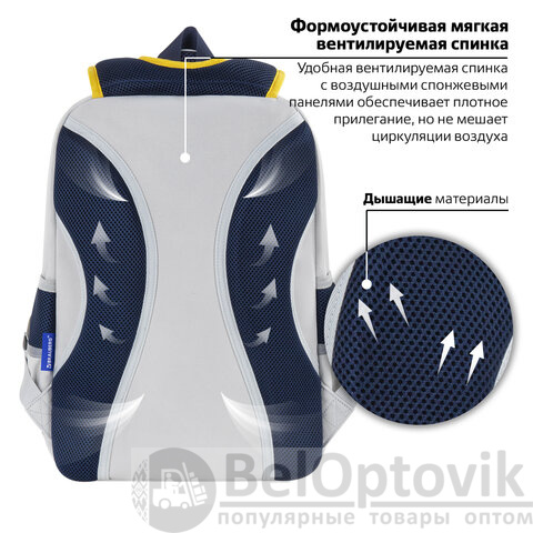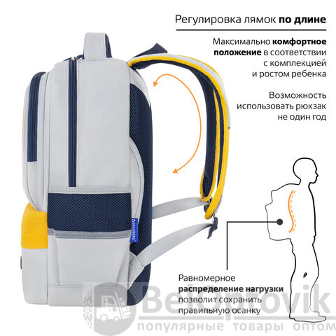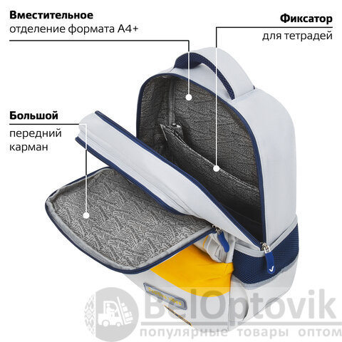 В основном отделении рюкзака можно легко и быстро разместить учебники и тетради формата А4+, а также воспользоваться прижимными разделителями. Спереди рюкзака располагаются два больших кармана на молнии, которые вмещают тетради формата А5 и прочие канцелярские принадлежности, и небольшой карман для различных мелочей или телефона. Такая организация пространства позволит держать школьные принадлежности в сохранности и поможет приучить ребенка к порядку.
