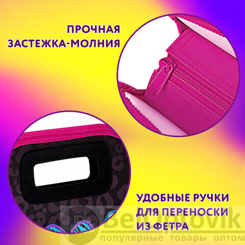 Практичная широкая папка-сумка на молнии защитит содержимое от замятий и повреждений. Яркая и четкая печать дизайна с двух сторон папки. Застегивается на молнию по верхнему краю. Двойные фетровые ручки способствуют комфортной переноске при большой нагрузке. Прорезиненный материал на дне и по бокам папки создает водонепроницаемый эффект.