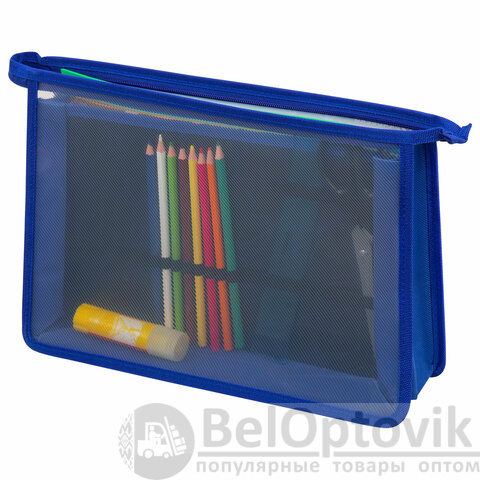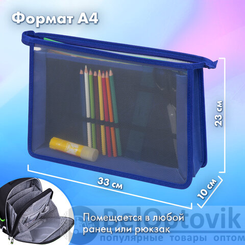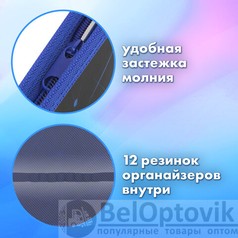 Папки выполнены из пластика, по краям – тканевая окантовка. Подобная конструкция является прочной и износостойкой, позволит защитить содержимое при переноске и хранении. Крепкая застежка-молния расположена по верхнему краю папки. Размер папки – 330х230 мм, ширина – 100 мм. Вмещают канцелярские и творческие принадлежности, а также бумагу формата А4. Разделитель отделений имеет органайзер-резинки для канцелярии.