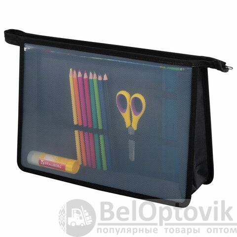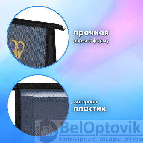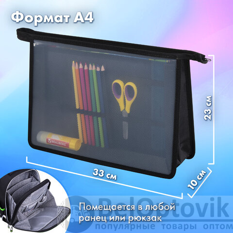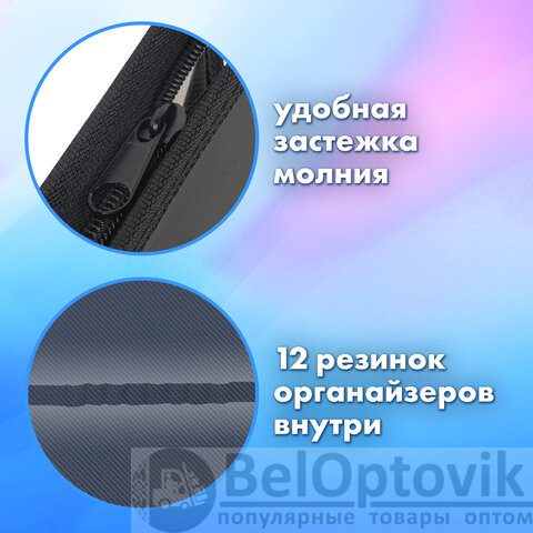 Папки выполнены из пластика, по краям – тканевая окантовка. Подобная конструкция является прочной и износостойкой, позволит защитить содержимое при переноске и хранении. Крепкая застежка-молния расположена по верхнему краю папки. Размер папки – 330х230 мм, ширина – 100 мм. Вмещают канцелярские и творческие принадлежности, а также бумагу формата А4. Разделитель отделений имеет органайзер-резинки для канцелярии.