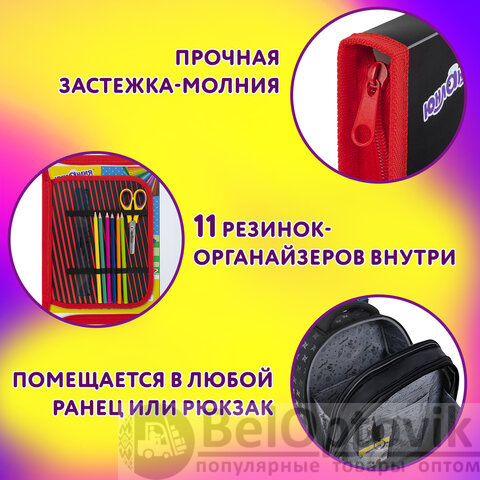Папка на молнии выполнена из прочного пластика, что обеспечивает долговечность и надежность. Двухсторонняя яркая и красочная печать коллекционного дизайна. Внутри одно основное отделение и откидная планка с резинками-органайзером для канцелярии. Размер папки – 330х230 мм, ширина – 25 мм. Застежка-молния, расположенная с трех сторон папки, обеспечивает быстрый доступ к содержимому. Идеально подходит для транспортировки и хранения канцелярских принадлежностей, тетрадей, учебников и пособий формата А4.
