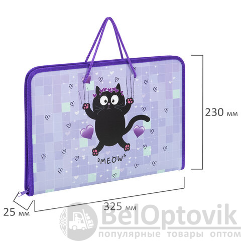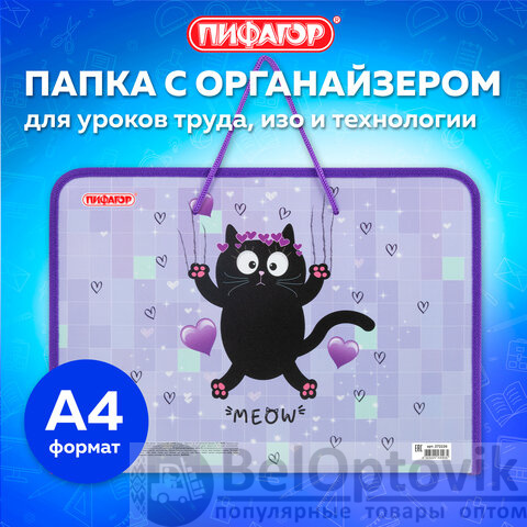 Папка для труда на молнии с ручками ПИФАГОР А4, 1 отделение, пластик, органайзер, "Falling cat", 272226