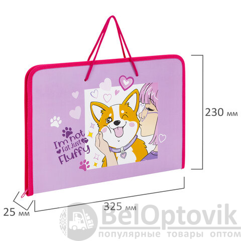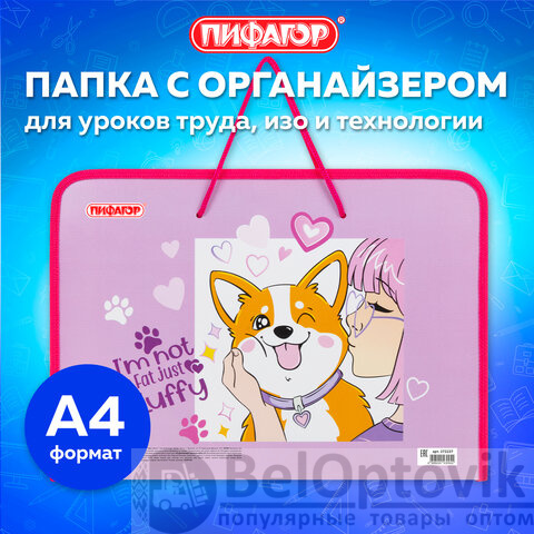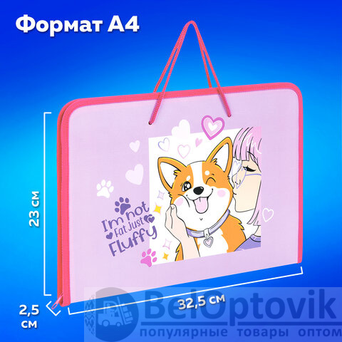 Папка для труда на молнии с ручками ПИФАГОР А4, 1 отделение, пластик, органайзер, "Fluffy akita", 272227