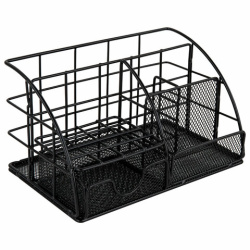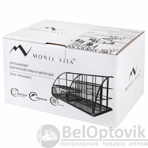 Изготовлен из металлической сетки. Имеет размеры 140х220х127 мм. Состоит из пяти секций. Благодаря своему стильному дизайну, удобству использования и надежности, органайзер MONTE VITA станет незаменимым аксессуаром для вашего комфорта. Он обеспечит удобное хранение вашей канцелярии, косметики и прочих мелочей, а также легкий доступ к ним.
