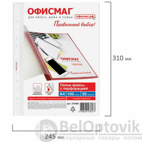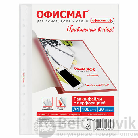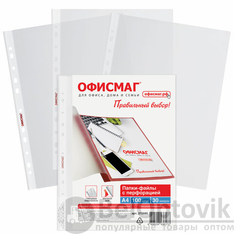 Папки-файлы перфорированные А4 ОФИСМАГ "Стандарт", КОМПЛЕКТ 100 шт., гладкие, 30 мкм, 272680