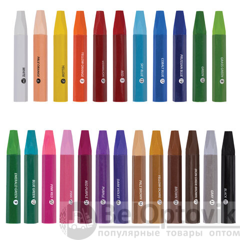 Каждый мелок завернут в бумажную этикетку, что предохраняет от загрязнений, снижает скольжение, увеличивает прочность. Восковые мелки находятся на пластиковой подложке, которую можно вытащить, что поможет при выборе цвета. Дополнительно упакованы в короб с термоусадкой. Надежная упаковка защитит мелки от повреждений.