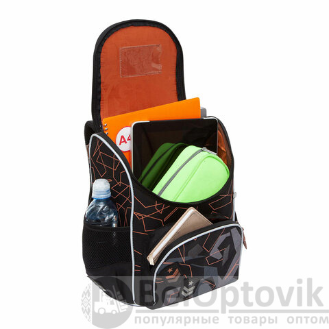 У ранца одно большое отделение с разделителем для учебных пособий формата А4. Ранец широко открывается, обеспечивая легкий доступ к содержимому. У него есть фронтальный карман на молнии для разных мелочей, удобная ручка и два вместительных боковых кармана. В комплекте к ранцу прилагается мешок для обуви.