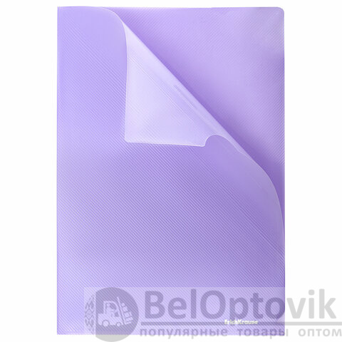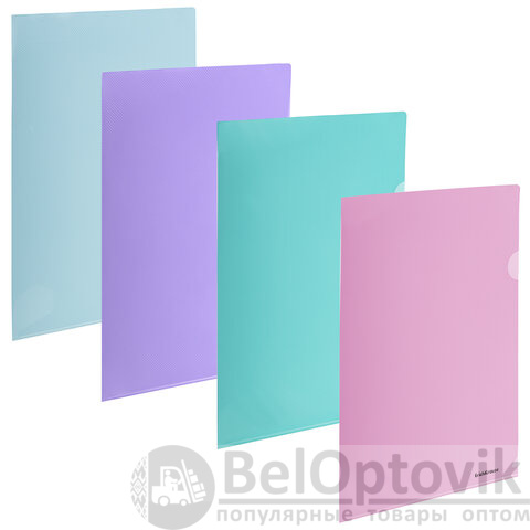 Изготовлена из высококачественного непрозрачного пластика с текстурой поверхности "диагональ", на которой не видно отпечатков пальцев и мелких царапин. Папка вмещает до 20 бумажных листов. Цвет папки – ассорти: голубой, мятный, розовый, фиолетовый. Размер – 220х310 мм, толщина пластика – 180 мкм.