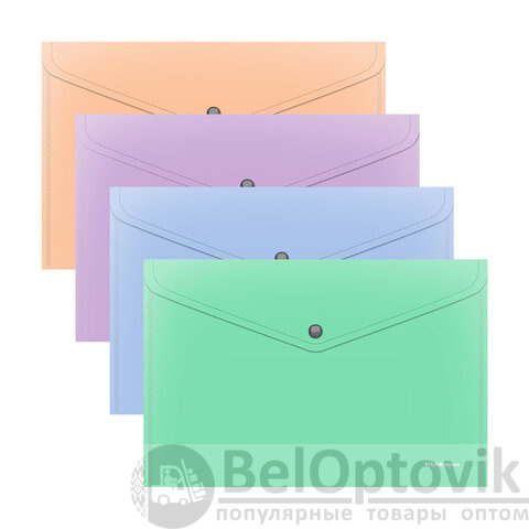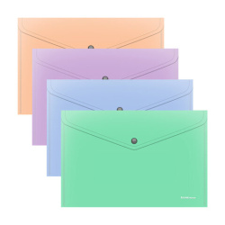 Предназначена для хранения и транспортировки небольшого количества документов. Цвет папки – ассорти: голубой, зеленый, персиковый, фиолетовый. Надежная застежка-кнопка обеспечивает быстрый доступ к документам. Папка вмещает до 120 бумажных листов. Размер – 232х333 мм, толщина – 0,18 мм.