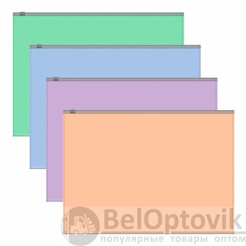 Цвет – ассорти: голубой, мятный, розовый, фиолетовый. Удобная ZIP-молния обеспечивает быстрый доступ к бумагам. Папка-конверт вмещает до 100 бумажных листов. Размер ZIP-пакета – 334х246 мм, толщина материала – 180 мкм.