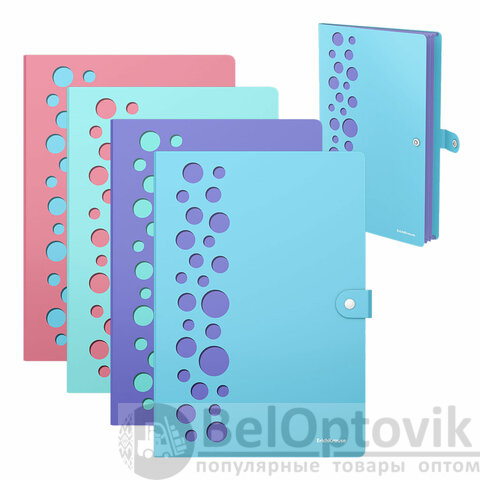Цвет папки – ассорти: голубой, мятный, розовый, фиолетовый, цвет отделений – ассорти: голубой, мятный, розовый, фиолетовый. Надежная застежка-кнопка обеспечивает быстрый доступ к бумагам. Папка вмещает до 150 бумажных листов. Размер папки – 244х330х17 мм, толщина материала – 600 мкм.