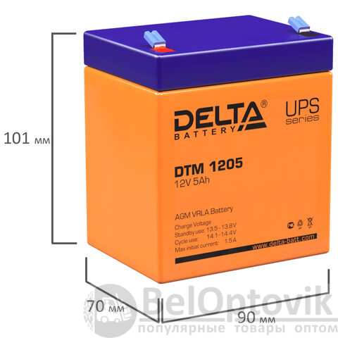 Аккумуляторная батарея для ИБП любых торговых марок, 12 В, 5 Ач, 90х70х101 мм, DELTA, DTM 1205